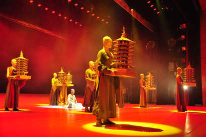 凤凰网华人佛教浙江讯:2013年11月30日晚上,“2013·浙江国际华严文化节”开幕式暨大型原创佛教舞台剧《行愿》首演,在浙江丽水龙泉大剧院隆重举行。浙江省、市各级相关领导和来自柬埔寨、泰国、缅甸、韩国、越南、老挝、蒙古、斯里兰卡、美国、俄罗斯、澳洲等29个国家和地区的高僧大德和几十位专家学者、文化名人及社会各界人士千余人出席开幕式。开幕式由浙江省佛教协会副会长光泉法师主持,丽水市佛教协会会长、崇仁寺住持大愿法师致欢迎辞,浙江省龙泉市市长季柏林、浙江佛教协会会长怡藏法师、省民宗委副主任倪忠扬分别致辞。之后致辞嘉宾与海内外嘉宾代表共同触动启动球。