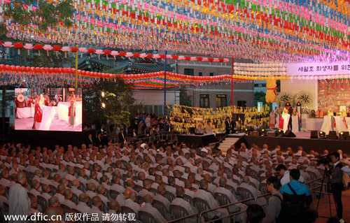 当地时间2014年5月20日,韩国首尔曹溪寺的僧侣们为岁月号遇难者举行超度仪式。