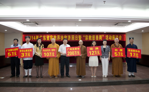 2014年6月27日上午,广东省民族宗教委召开2014年广东省宗教界扶贫济困日暨宗教慈善周活动座谈会,通报3年来广东省宗教界扶贫济困工作情况,动员部署2014年宗教慈善周活动,并开展现场捐款活动,当场收到捐款542万元。省民族宗教委领导,省佛教协会、省道教协会、省伊斯兰教协会、省天主教两会、省基督教两会等全省性宗教团体副秘书长以上负责人,各市宗教界以及广州阿拉伯商会代表约60人参加了座谈会。省委统战部副部长、省民族宗教委主任陈小山出席座谈会并作讲话。