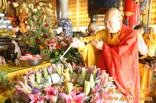 上午九时,浴佛法会正式开始,寺内钟鼓齐鸣。中国佛教协会副会长、湖南省佛教协会会长、长沙麓山寺方丈圣辉大和尚从方丈室迎请太子佛圣像至大雄宝殿,拈香主法,说浴佛法语,并带领两序舀香汤净水灌沐太子圣像。