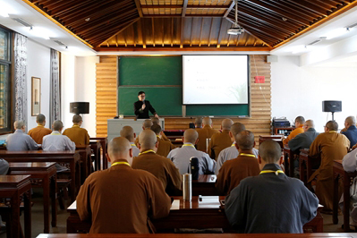 培训活动中,柳天旸顾问为与会辩手详细介绍了辩论活动的分类构成,详尽说明了辩手的形象及定位。通过对多段辩论活动精彩片段的回顾与点评,生动的阐述各辩手的分工协作,并立足佛教经典辩论的特殊性与专业性与广大佛学院领队和辩手进行了充分交流。