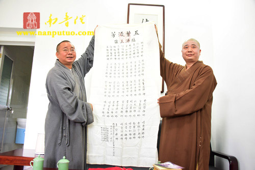 2016年6月12日上午,正值闽南佛学院第八届研究生毕业论文答辩之际,原妙湛和尚衣钵、终南山净业寺住持本如法师积极响应支持南普陀寺、闽南佛学院“妙湛和尚纪念堂”的筹建工作,专程恭送妙湛和尚的祖衣、法卷、十世班禅大师送给妙老的哈达等妙老的法物回南普陀寺。则悟方丈携后堂净心法师,副寺弘来法师、界淞法师,衣钵兼知客法旺法师等在慈善会三楼会议室恭迎妙老法物。