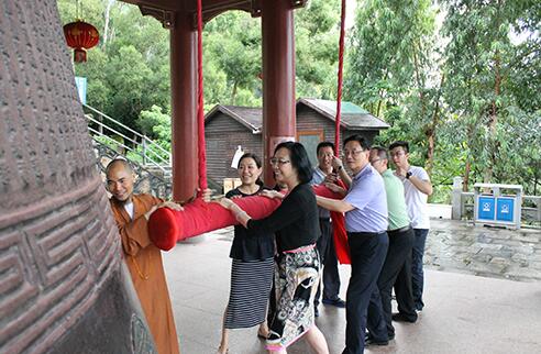 国家宗教局外事司司长肖虹一行在忠明法师等人的陪同下参观了寺院的重要堂口。随后来到祈福钟殿,忠明法师与肖司长一行及省市区领导一同撞响万福万寿和平钟,为海峡两岸人民祈福,同祈海峡两岸和平发展。