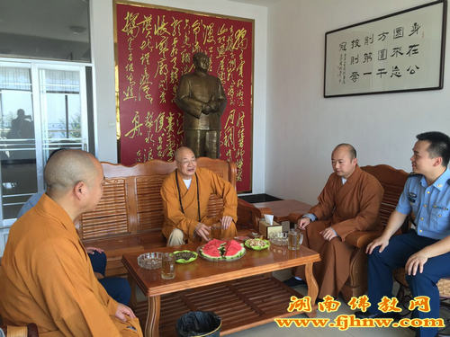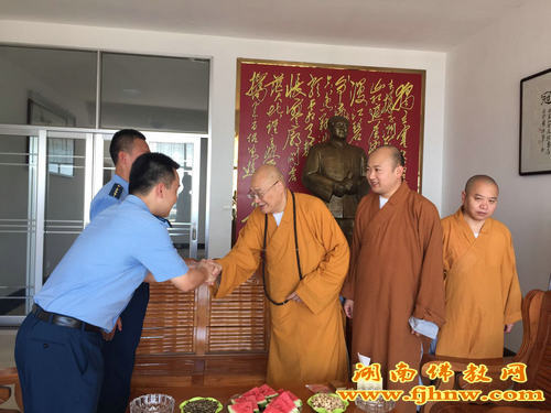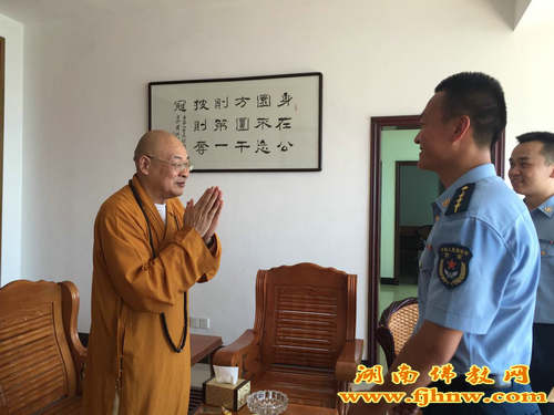 在中国人民解放军建军89周年纪念日来临之际,2016年7月29日上午,中国佛教协会副会长、湖南省佛教协会会长、长沙麓山寺方丈圣辉大和尚带领湖南省佛教协会副秘书长、办公室主任、麓山寺监院永兴法师、知客果坚法师等一行前往空军岳麓山中心雷达站进行慰问,受到雷达站刘宇站长、李彦晓教导员等雷达站官兵的热情接待。