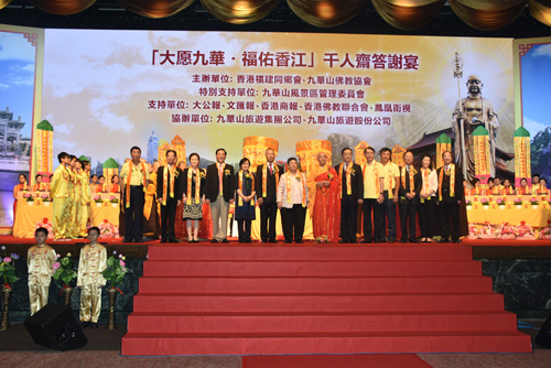 由香港福建同乡会、九华山佛教协会共同主办的“‘大愿九华.福佑香江’千人斋答谢宴”,20日在湾仔会展中心隆重举行。福建省政协副主席张燮飞,中联办协调部部长沈沖应邀主礼。香港福建同乡会会长、千人斋宴总指挥陈聪聪与社会各界友好、会员乡亲近2000人齐聚一堂,为香港祈福。